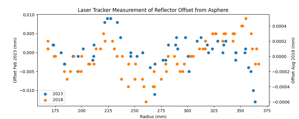 The flatness of the optic, or rather its consistency with the desired asphere defined above, was measured during and after manufacturing. These measurements were made using a Hexagon Laser Tracker. We carefully touched the surface of the Reflector with a 1-inch retro reflector to get these measurements. The plot below shows the results from measurements made in 2018 and then in 2023. They match quite well, although the measurement errors seem to increase in 2023. It shows that the shape of the milled aluminum piece follows that of the asphere within approximately 10 µm, and potentially within 1 µm based on the initial measurements.