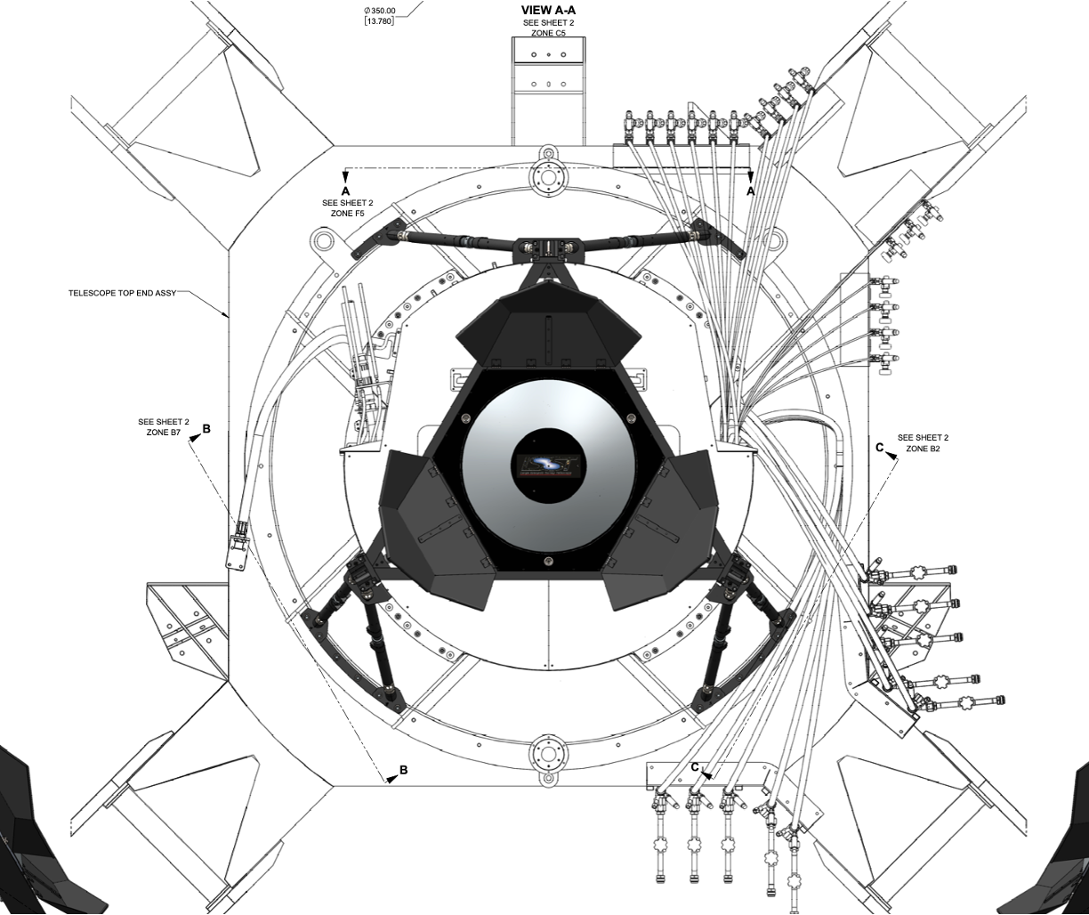 The mirror is attached to the top of the camera via six hexapod legs that extend over the pancake wrap. They are adjustable by hand so the Reflector can be aligned with the optical axis of the TMA. They are held to the structure with restrainer brackets so they can be easily attached to the reflector.