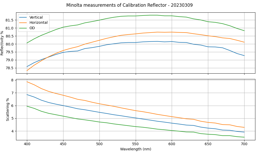 Before shipping to Tucson, we measured the Reflectivity and Scattering properties of the Reflector. The average reflectance is about 80%, where fresh aluminum can have reflectance up to 91% on average. The higher levels of scattering are perhaps not surprising with the manufacturing of the optics